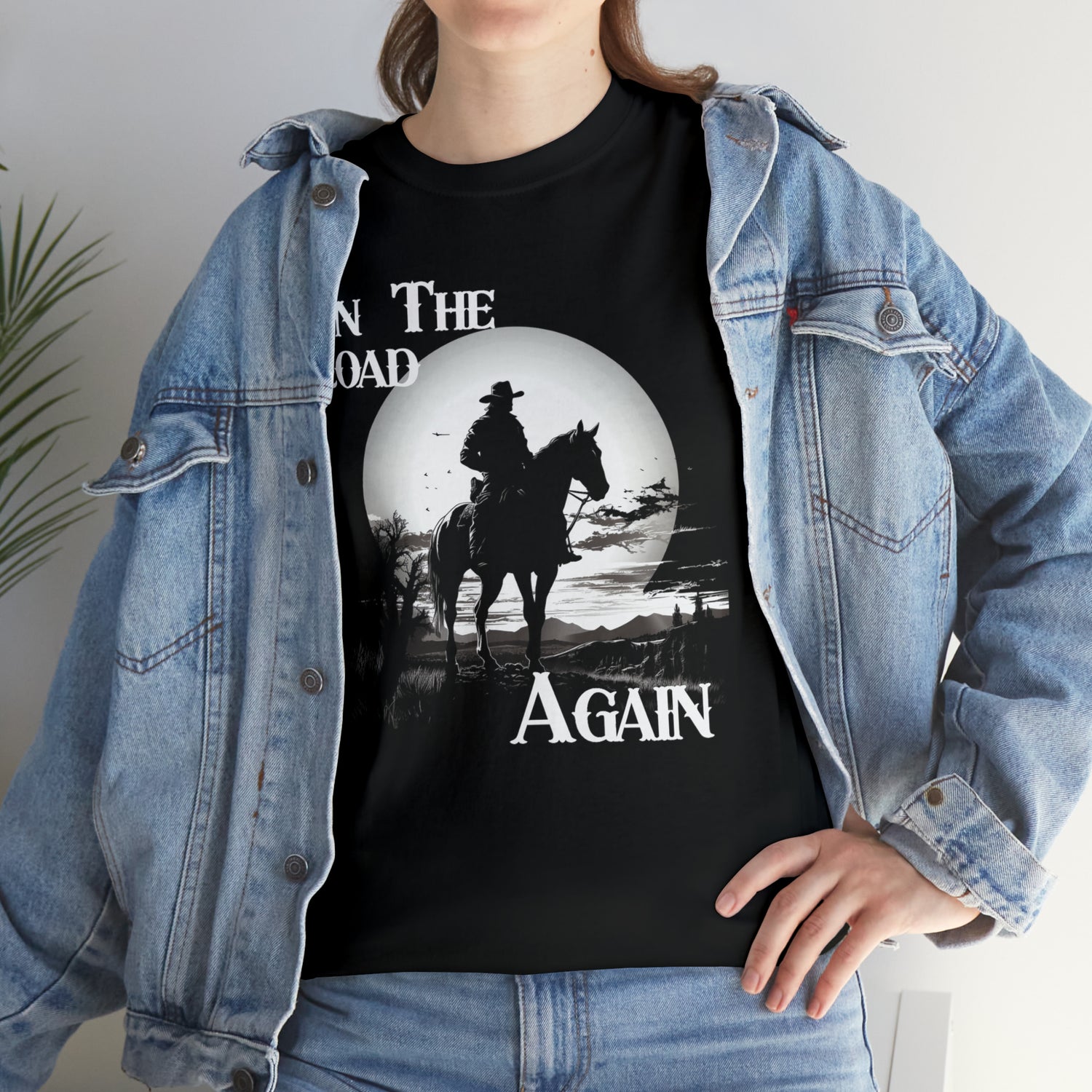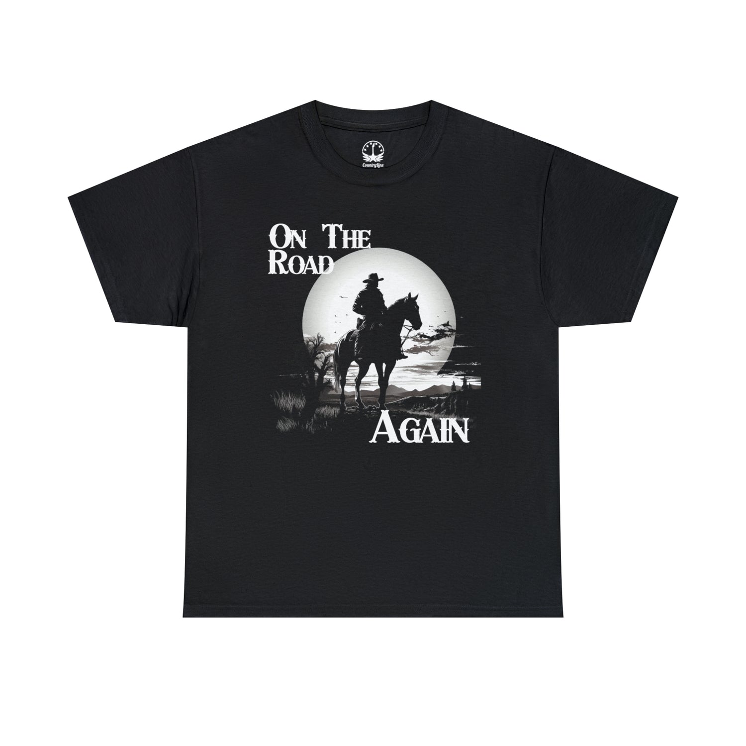Don't miss the opportunity to make a statement with our "On the Road Again" t-shirt. Experience the comfort, quality, and style that this tee has to offer. Order yours today and let your inner cowboy or cowgirl shine as you embark on new journeys and embrace the spirit of the open road.